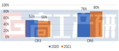2020-2021年中国负极材料行业集中度(%)